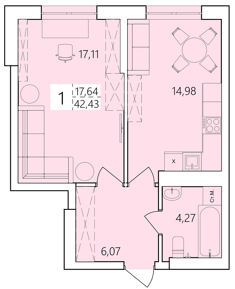 1-к квартира, 42 м², 18/25 эт., ЖК «Волна»