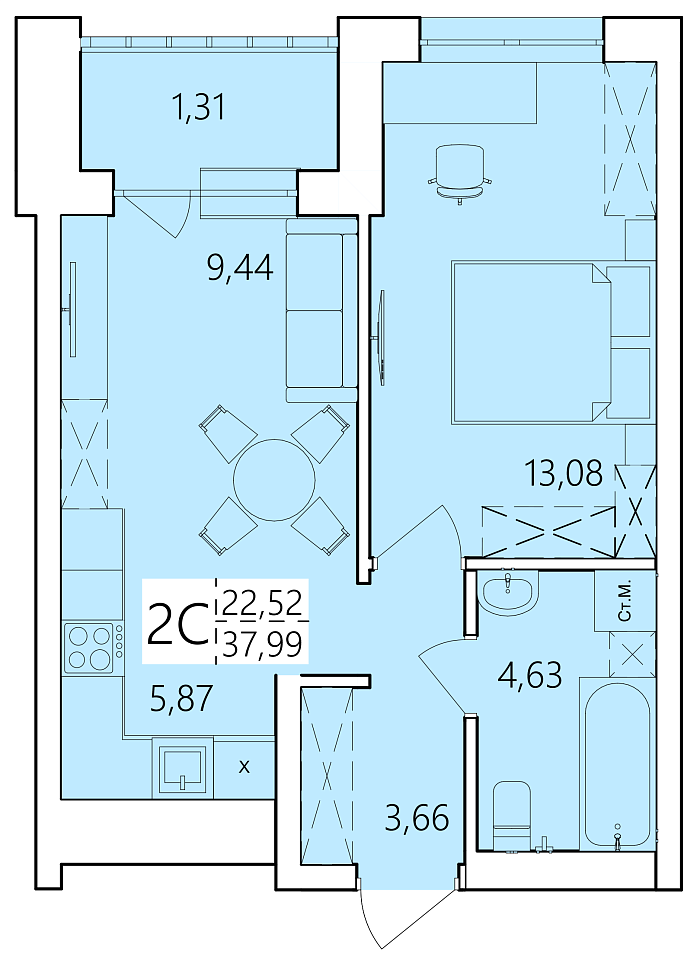2-к квартира, 37 м², 18/25 эт., ЖК «Волна»