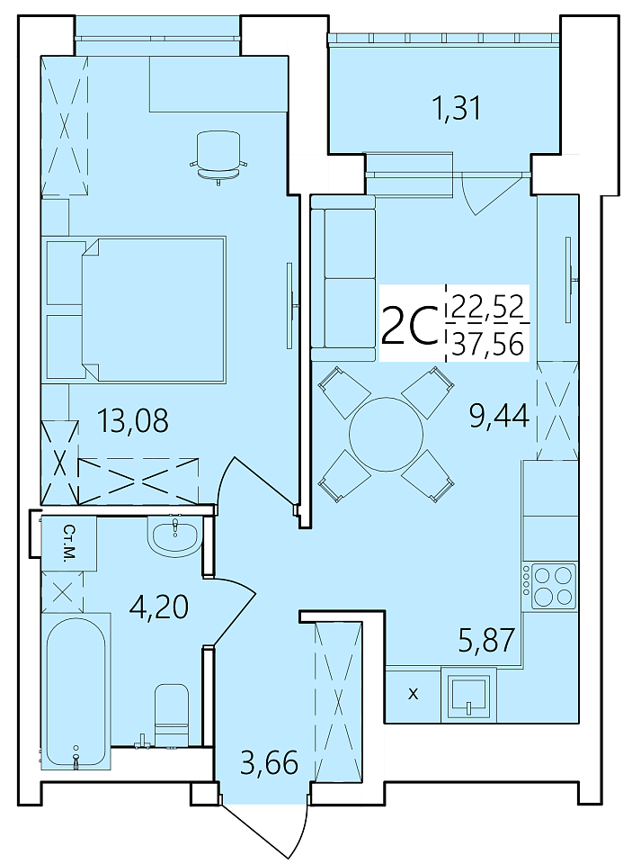 Общая площадь 37.56 м2