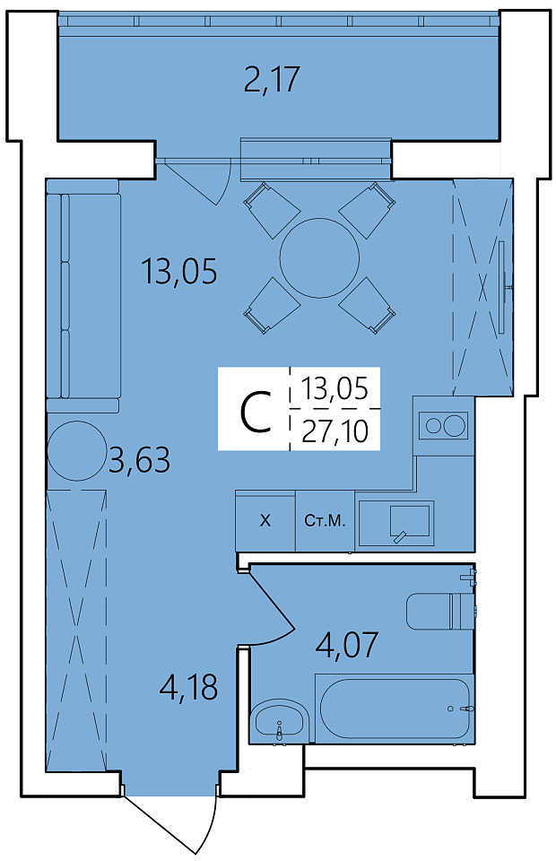 Общая площадь 27.1 м2