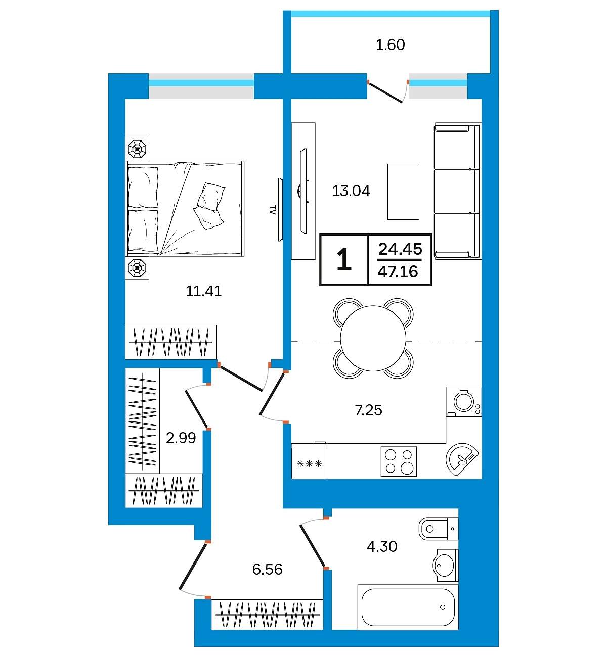 Общая площадь: 47.16 м2